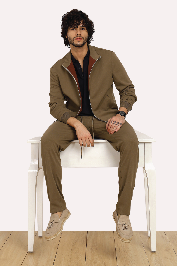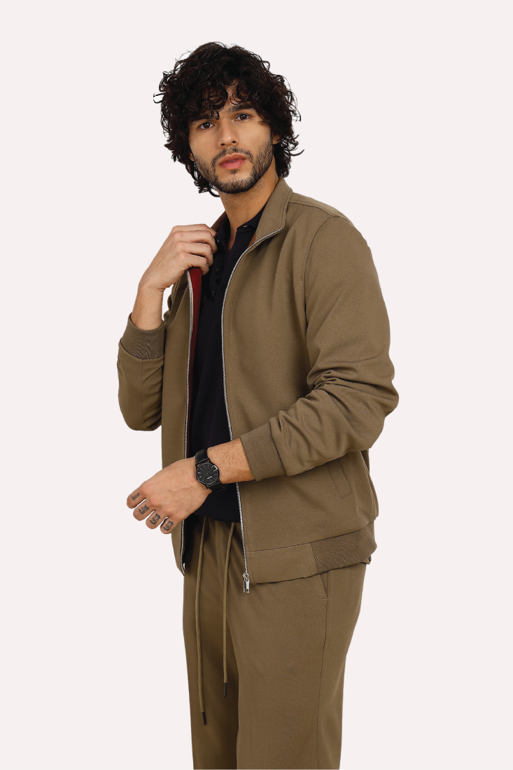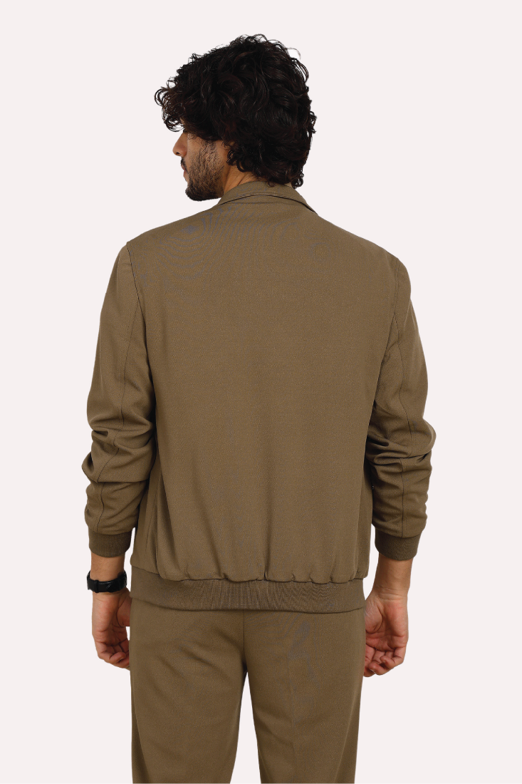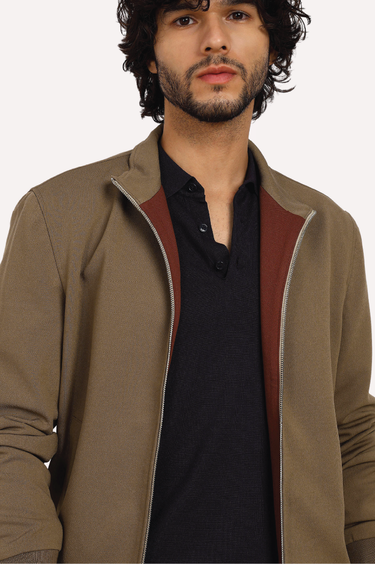 A classic bomber jacket made in blended fabric with spandex, anti wrinkle fabric. featuring a contrast fabric on the inside and ribbed cuff and hem. stand collar with front zipper fastening.