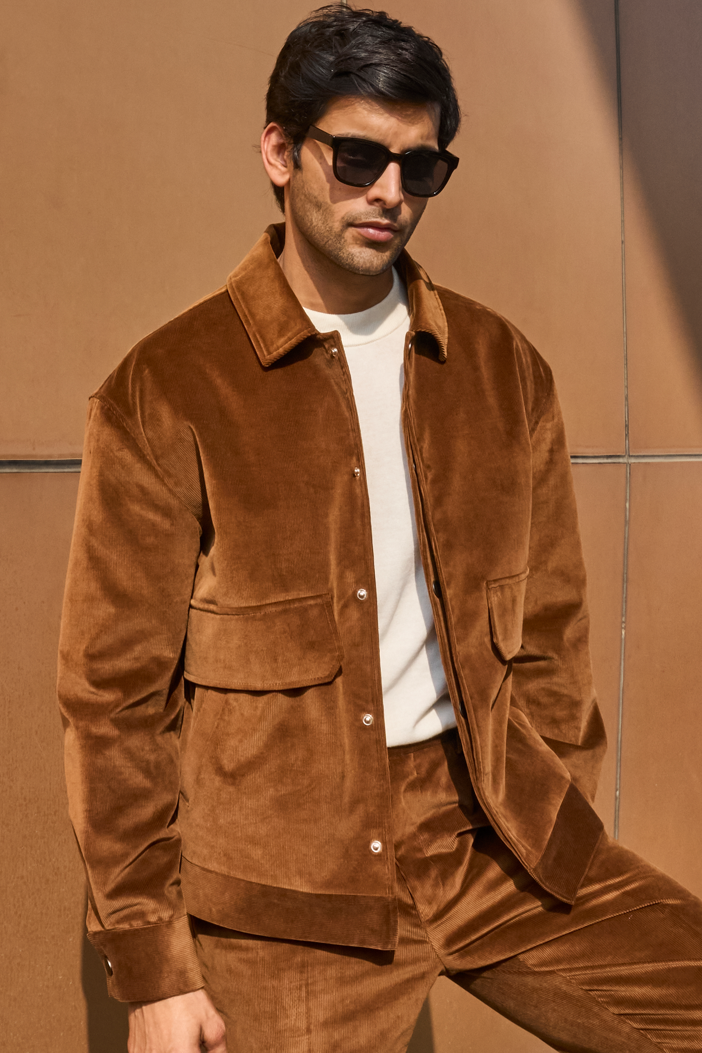 Relaxed fit jacket crafted from lightly padded corduroy Featuring a collared neckline and long sleeves with snap buttoned cuffs. Patch pockets at sides with single welt pocket at front. sanp button fastening at front.