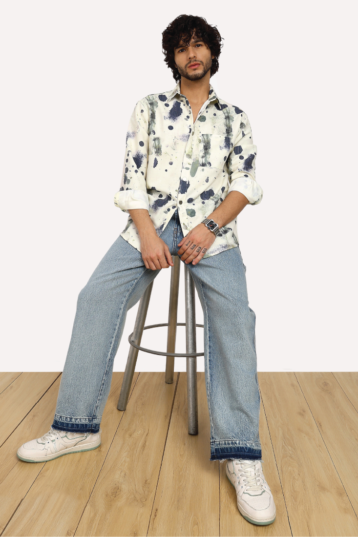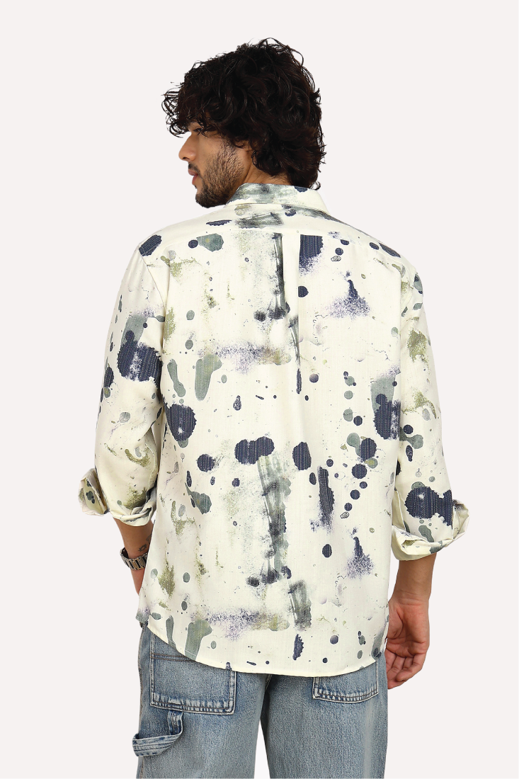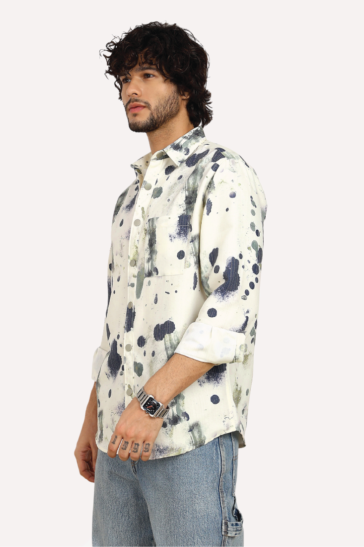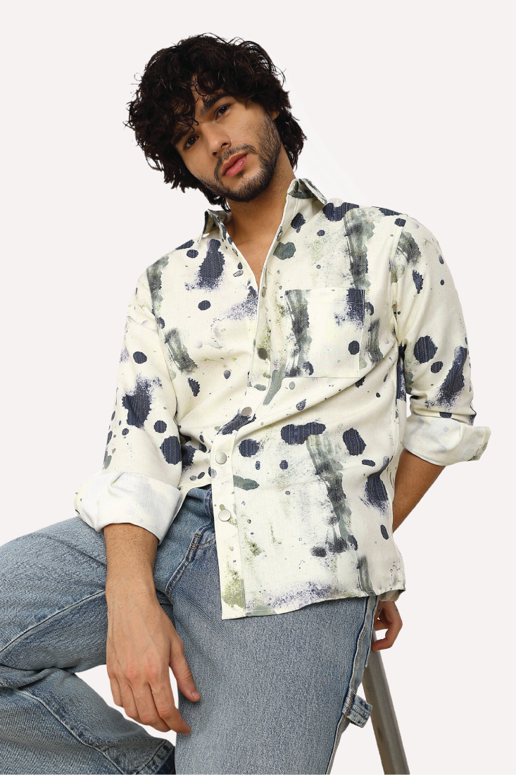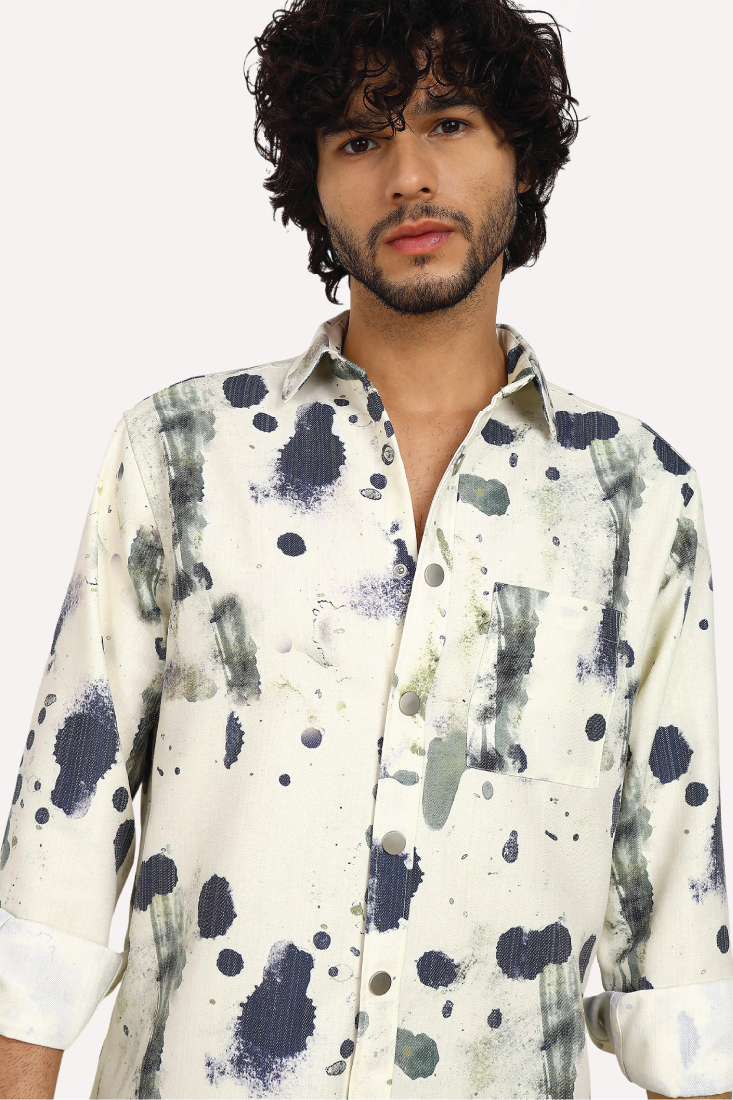 Relaxed fit shirt crafted in cotton twill fabric, featuring long sleeves with snap button fastening at front and sleeves.