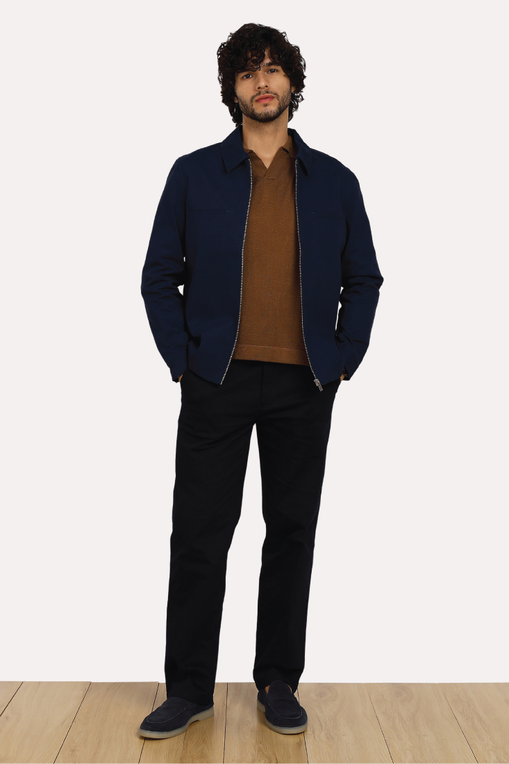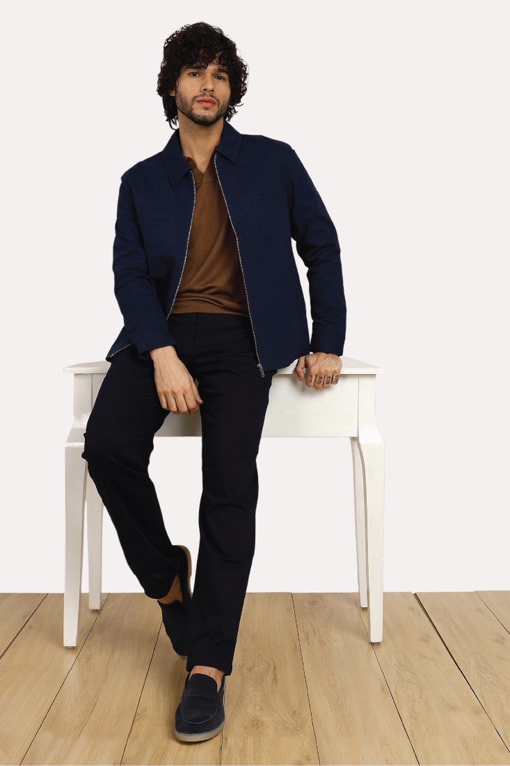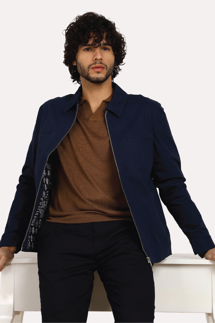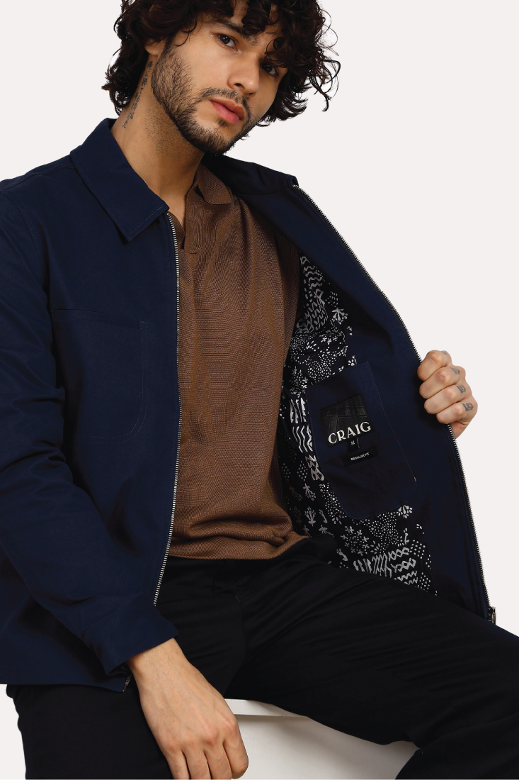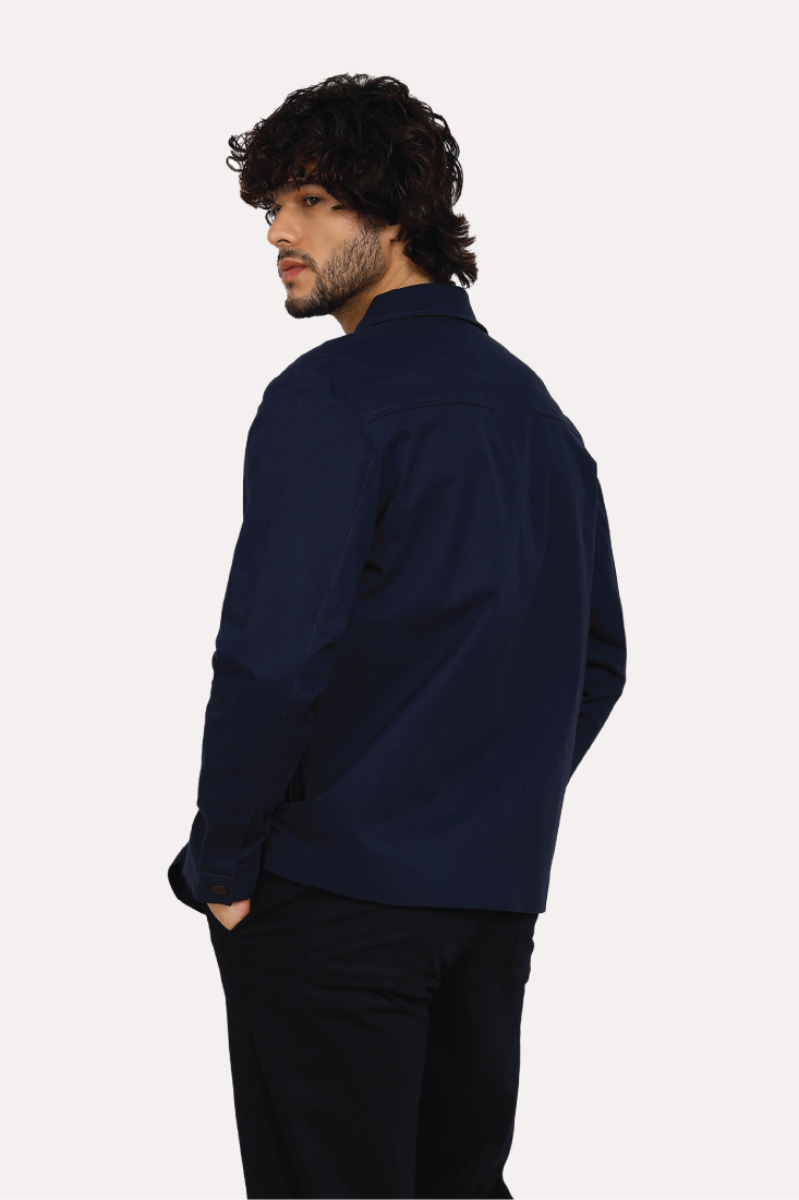 Regular fit overshirt made in 100% lighweight cotton fabric. Lapel collars, welt pockets at front with mock patch pocket detailing, long sleeves with snap fastening and zipper at centre front.