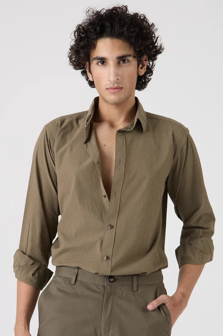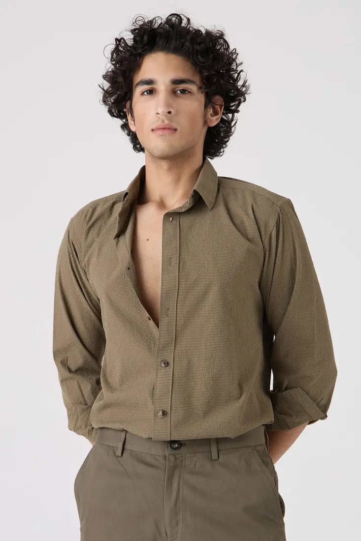 Regular fit collared shirt made of 100% cotton seersucker fabric, featuring long sleevs with buttoned cuffs and buttoned up front.