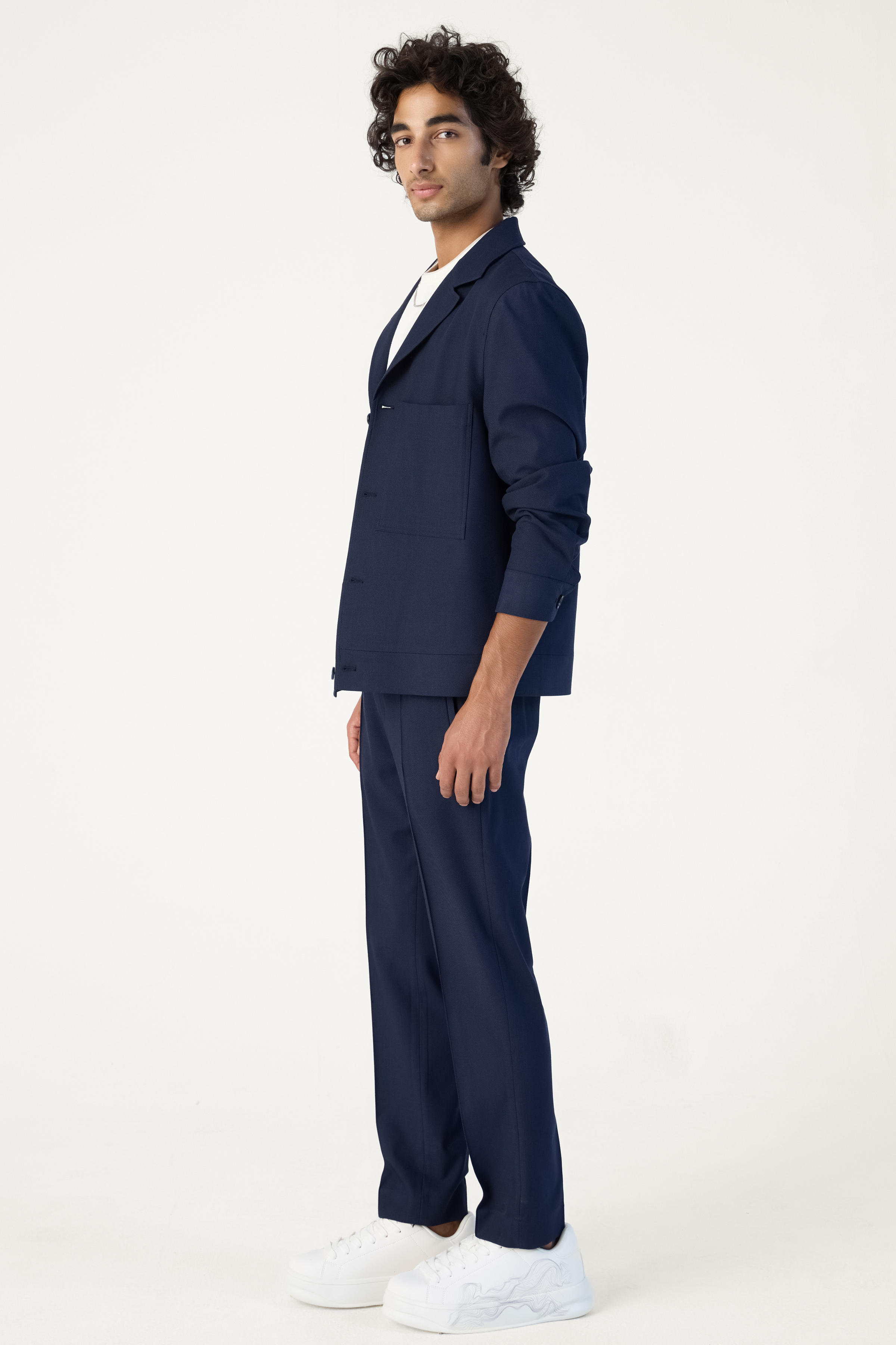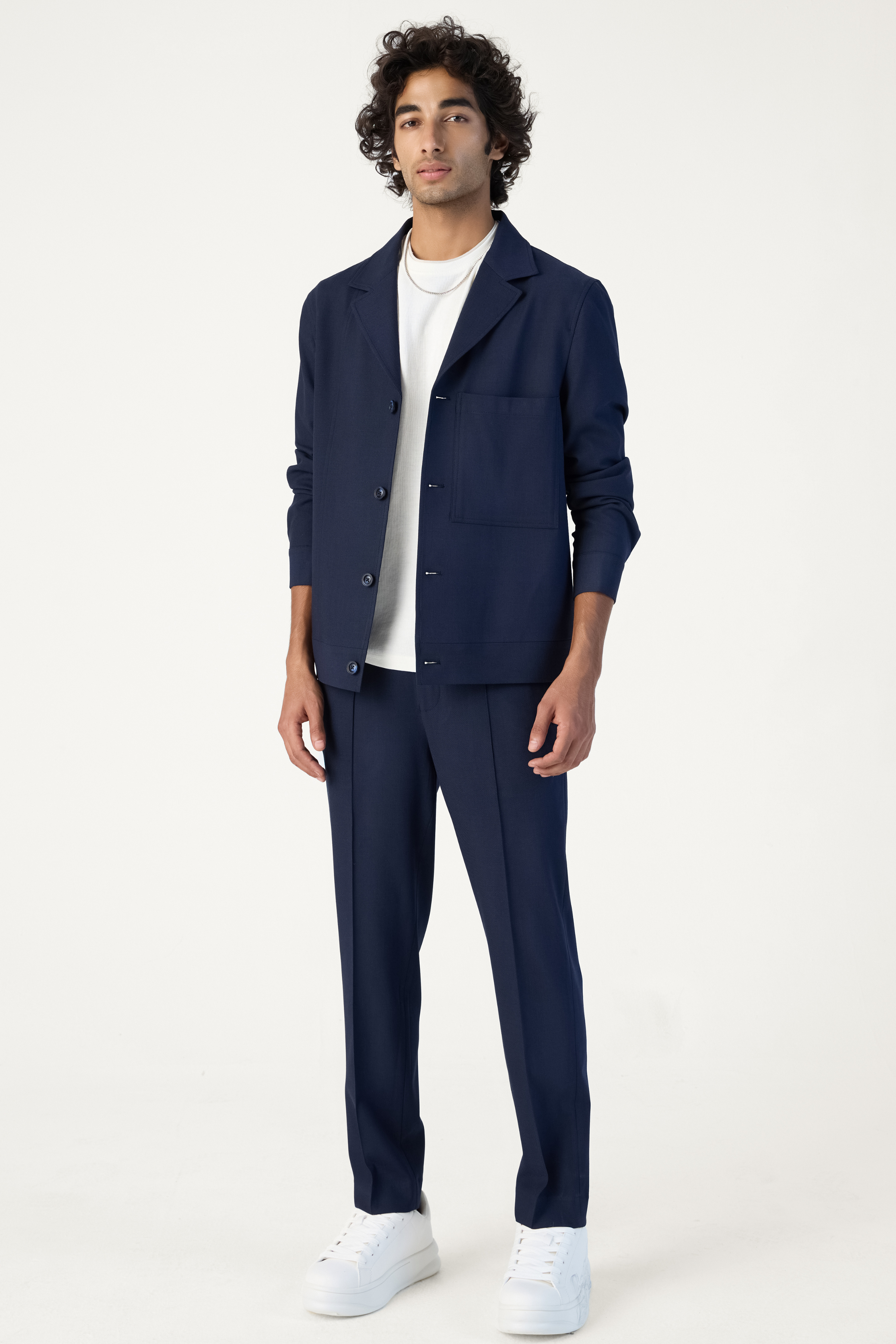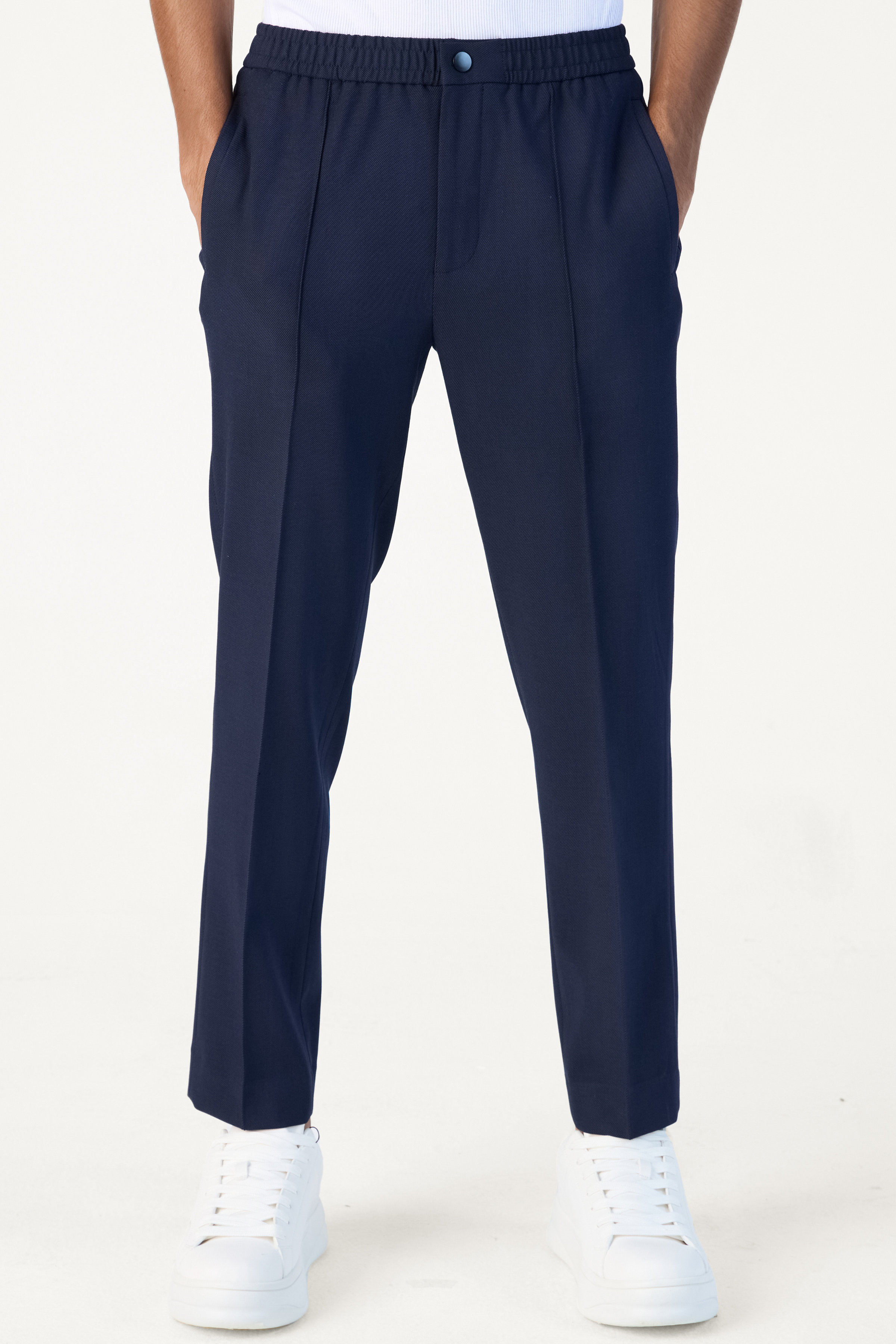 Slim fit trousers made of stretchy fabric. Featuring an elasticated waistband with snap button , side pockets and rear welt pocket with zip.
